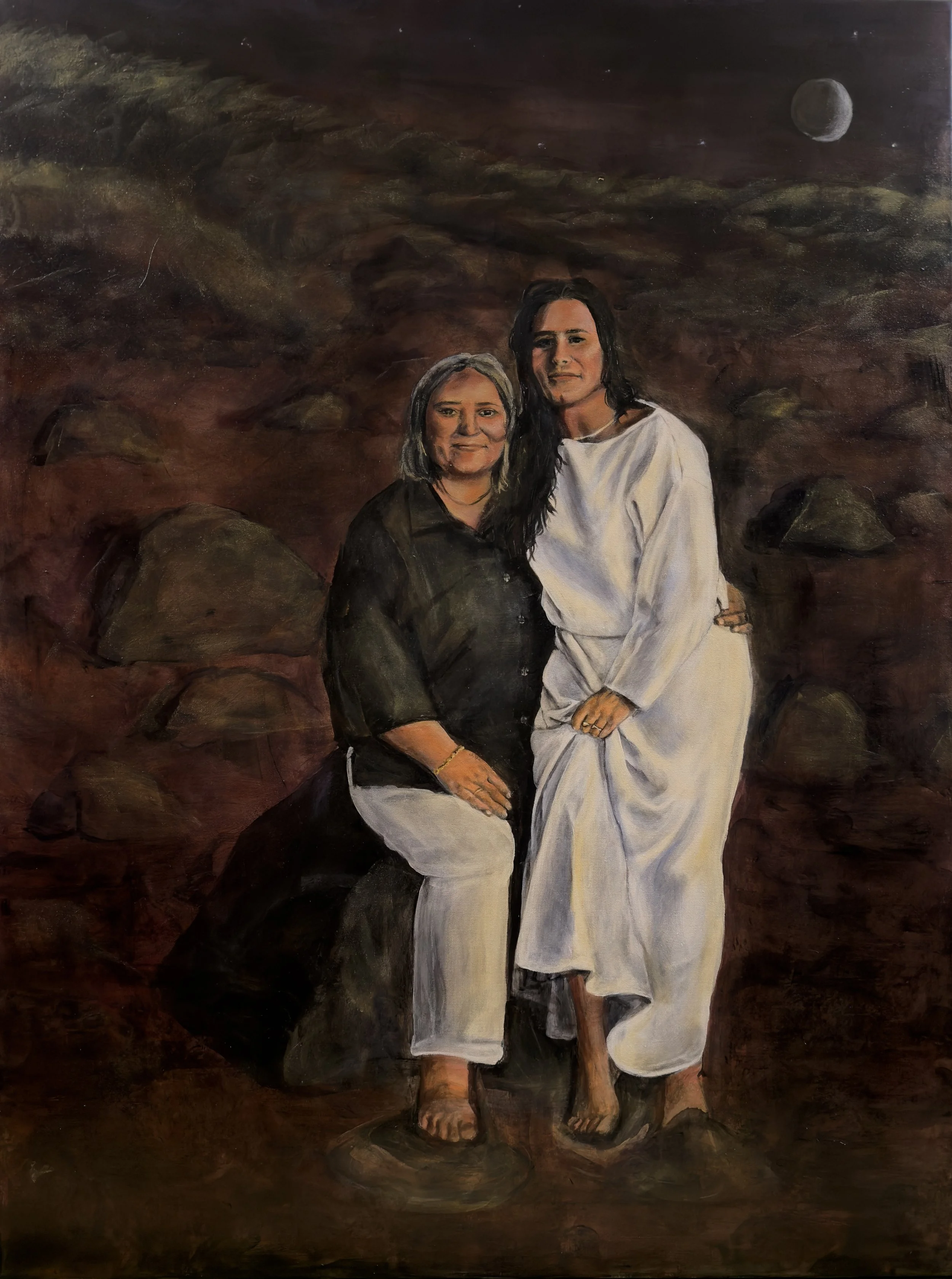 The figures are painted in their familiar, instinctual posture, Arielle seated on Lillie’s knee, a position that reflects comfort, trust, and embodied knowing. This gesture resists formality in favor of truth. They are not posed for spectacle, but held in presence.