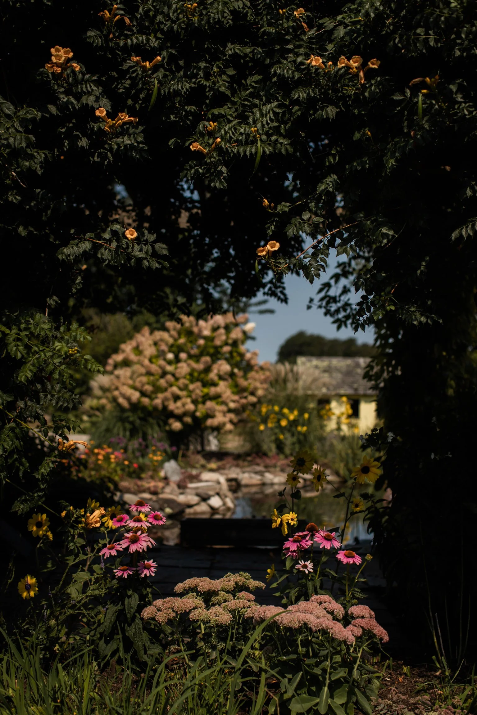 Above the figures, a waxing crescent moon appears at 27% illumination, marking September 27th, the date of Arielle and Lillie’s marriage. The moon functions as both a timestamp and a symbol, anchoring the painting in cycles, intention, and continuity. While the painting depicts two women in love on their wedding day, Hixson imagines them as witches practicing the ultimate spell: love sustained through commitment. Their union becomes not only romantic but elemental, woven into earth, tide, and sky.