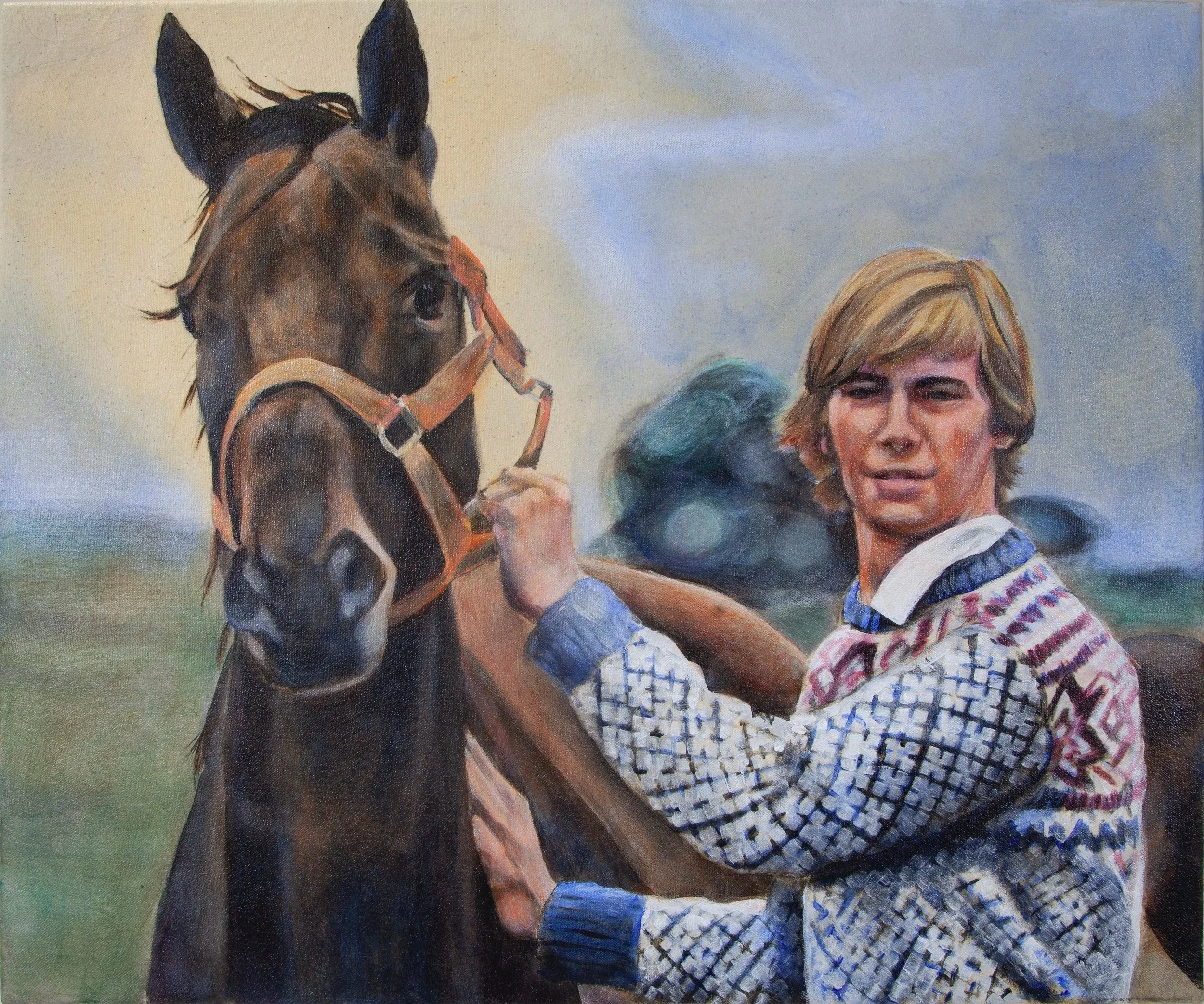 The most important element of the painting is the gesture of his father gently touching the horse. It embodies who he was; soft-spoken, kind, and deeply tender toward the beings he cared for. In honoring that gentleness, Hixson hoped to preserve not only his likeness, but the spirit that shaped his earliest ideas of love, strength, and connection.